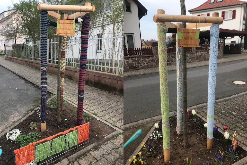 Was soll man davon halten? Da pflegen Bürgerinnen (einige schon seit Jahren) Bäume und das Drumherum am Straßenrand im Ort, schmücken die Stützpfähle mit Selbstgestricktem. Dann machen sie auf einem Holzschild kenntlich, dass sie und die Initiative „Netzwerk Bergsträßer Wald“ sich auf diese Weise für ein schönes Alsbach-Hähnlein engagieren. Und was passiert?