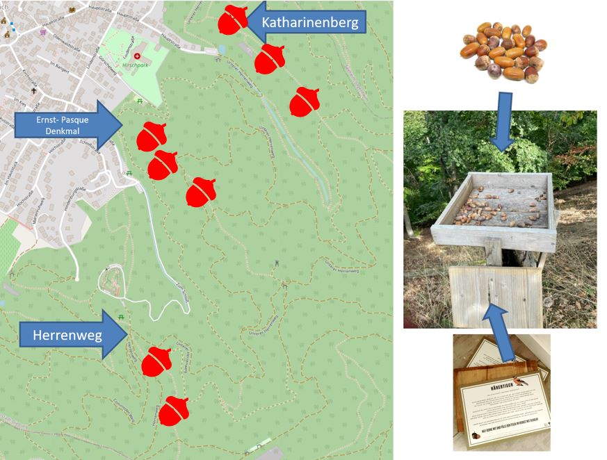 Im letzten Jahr wurden in einer gemeinsamen Aktion von Lernort Natur und IUHAS Hähertische für den Alsbacher Wald gebaut und dort aufgestellt (s. Standortkarte). Wer in den nächsten Tagen (bzw. generell im Herbst) im Wald unterwegs ist, kann gerne immer mal wieder einen Blick in die Hähertische werfen und Eicheln nachfüllen. Eichelhäher werden diese dann wie Eichhörnchen sammeln, verstecken und damit unbewusst auch pflanzen. Damit helfen wir dem Wald, sich selbst zu verjüngen.