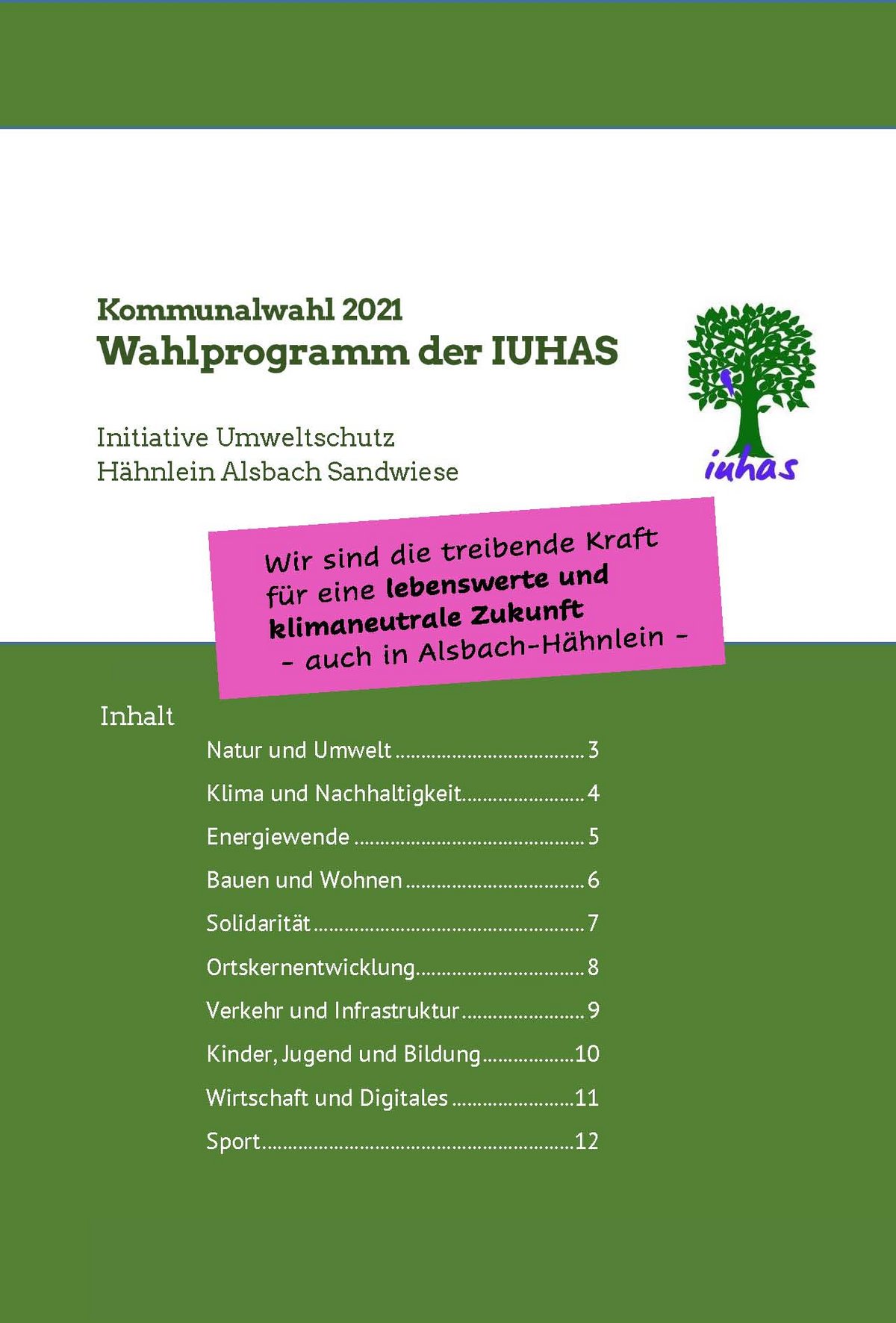 Die Wurzeln der IUHAS liegen in der Anti-Atomkraft- und Umweltbewegung vor etwas mehr als 40 Jahren. "Wir haben die Erde von unseren Kindern nur geborgt.", war die Überschrift eines Flugblattes gegen das AKW Biblis. 1981 wurde die Initiative Umweltschutz Hähnlein Alsbach Sand-wiese das erste Mal in die Gemeindevertretung gewählt.